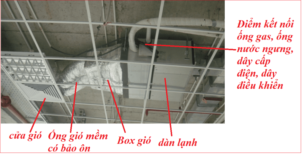 – Còn đối vói dàn lạnh của điều hòa nối ống gió sẽ được đặt dấu bên trong trần. Theo đó trên dàn lạnh của điều hòa âm trần nối ống gió sẽ hoạt động tương tự các dòng điều hòa khác. Tuy nhiên, đầu gió ra (không khí đã được làm lạnh) có đồng thời nhiều đầu ra, mỗi đầu ra này sẽ được nối với 1 ống gió, từ đó người dùng có thể phân bổ không khí đến những điểm khác nhau trong nhà.